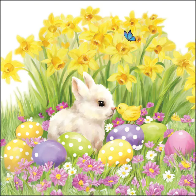 20 Oster-Servietten – Osterhäschen & Küken mit Ostereiern und Narzissen