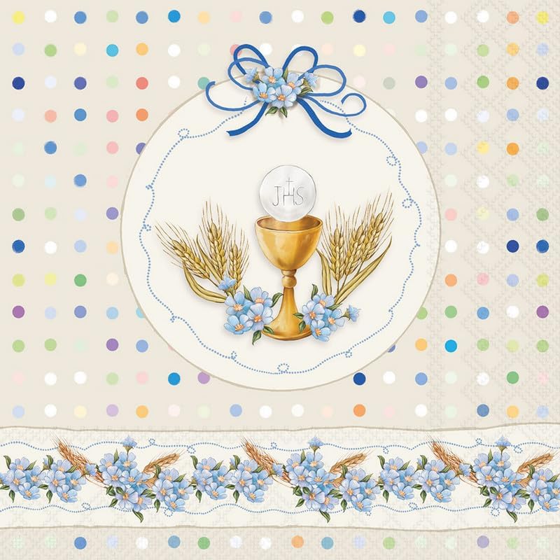 Diese 20 hochwertigen Servietten zeigen einen stilvollen Kommunionkelch (Cup) mit Ähren auf einem dezenten Punktemuster. Das klassische christliche Motiv symbolisiert Gemeinschaft, Glauben und Dankbarkeit und passt perfekt zu Kommunion, Konfirmation oder religiösen Familienfeiern.