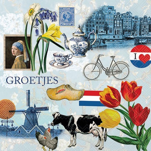 Startseite » Servietten » Lunch Servietten 33 cm » Reisen und Städte 33 cm » 20 Servietten Grüße aus Holland und den Niederlanden mit Tulpen, Windmühlen und Fahrrad 33cm als Tischdeko